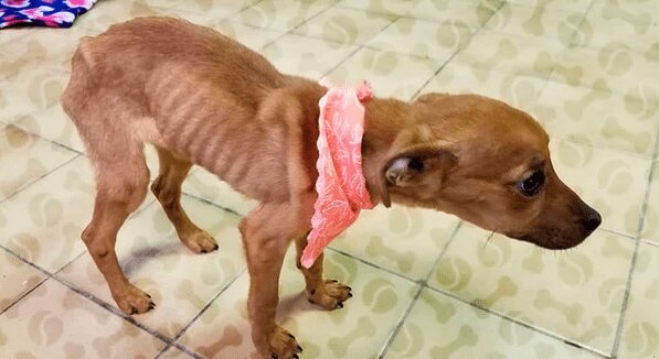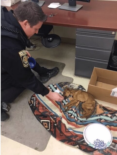 Funkcjonariusze przybyli na miejsce zdarzenia i zastali dom całkowicie zdemolowany, z wyłamanymi drzwiami. W zamkniętej sypialni ujrzeli straszny widok - na podłodze leżał niesamowicie wychudzony szczeniak! Ale jeszcze żył! Miał tylko tyle siły, by zacząć delikatnie merdać ogonem na widok ludzi, którzy w końcu go znaleźli!