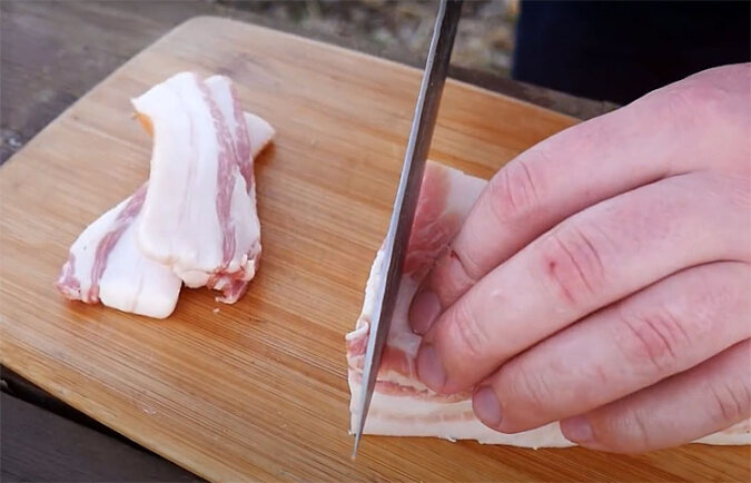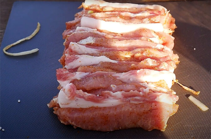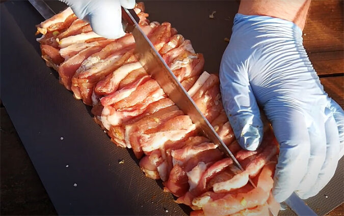 W tym celu należy nadziać mięso wraz ze słoniną na dwie szpadki, a następnie przekroić wzdłuż. Powtarzaj tę czynność, aż mięso się nie skończy.
