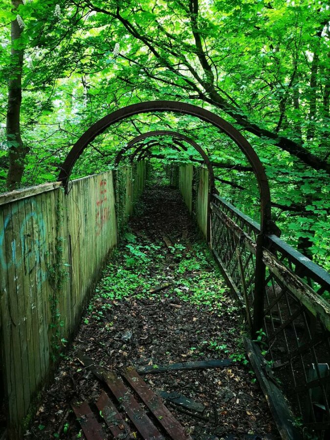 Przyroda próbuje przejąć opuszczone przejście dla pieszych. Hamilton, Szkocja