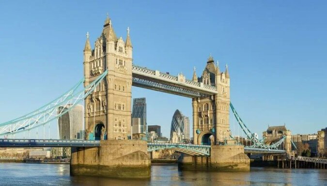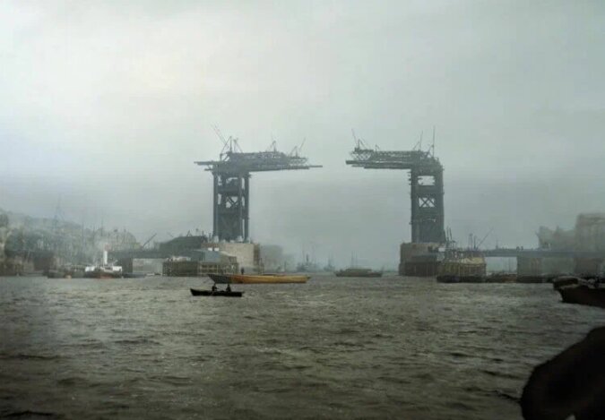 W centrum Londynu, tuż nad Tamizą, znajduje się słynny Tower Bridge. Nie należy go mylić z London Bridge, który znajduje się na północnym brzegu rzeki - są to zupełnie inne konstrukcje. Budowa mostu Tower Bridge rozpoczęła się w 1886 r., a jego otwarcie nastąpiło w 1894 r. Budowla nad Tamizą jest prawdopodobnie jednym z najważniejszych punktów orientacyjnych w Londynie i Wielkiej Brytanii, oczywiście po Big Benie. Autor projektu, Sir Horace Jones, przewidział, że środkowa część mostu będzie się podnosić w górę, aby umożliwić przepłynięcie pod nią pasażerskim statkom wodnym. Fotografia przedstawia proces budowy mostu w 1889 r.