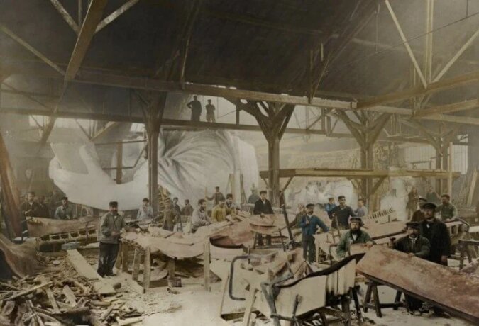 Historia budowy Statuy Wolności jest zapewne wielu osobom dobrze znana. W tworzeniu tego arcydzieła brał udział Gustave Eiffel, a rzeźbiarzem był Frederic Auguste Bartholdi. Wieża była darem Francji dla Stanów Zjednoczonych z okazji Wystawy Światowej w 1876 roku. Statua Wolności osiąga wysokość 93 metrów i jest wykonana głównie z różnych rodzajów metalu. Całkowita masa miedzi w tej konstrukcji wynosi 31 ton, masa stali 125 ton, a waga podstawy betonowej osiąga imponujące 27 000 ton. Poniższe zdjęcie przedstawia powstawanie części pomnika w pracowni francuskiego rzeźbiarza Frédérica Auguste'a Bartholdiego.