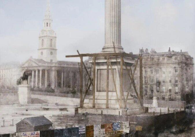 Wiele osób zna ciekawostki na temat Wieży Eiffla - być może masz już ich dość. Porozmawiajmy o arcydziele architektury, o którym rzadko się wspomina w innych artykułach. W Londynie, w samym sercu Trafalgar Square, znajduje się tak zwana Kolumna Nelsona. Została wzniesiona w latach 1840-1843 na cześć admirała Horatio Nelsona, który zginął tragicznie w bitwie pod Trafalgarem w 1805 r. Pomnik ma postać 46-metrowej kolumny granitowej, na szczycie której znajduje się 5,5-metrowy posąg przedstawiający Nelsona. Kolumna została odrestaurowana w 2006 r., a niektórzy ludzie, np. prowadzący program dla dzieci John Noakes, wspięli się na jej szczyt. Poniższy rysunek przedstawia kolumnę w kwietniu 1844 r.