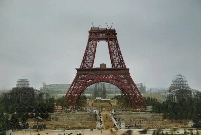 Budowa wieży Eiffla rozpoczęła się w styczniu 1887 roku. Powstała ona na potrzeby konkursu zorganizowanego przez założycieli Wystawy Światowej w Paryżu w 1889 roku. Architekci zostali poproszeni o stworzenie konstrukcji, która w pełni ukazywałaby osiągnięcia inżynieryjne i technologiczne Francji. O konkursie dowiedziało się oczywiście także biuro architekta Gustave'a Eiffla, który znalazł w archiwach projekty wieży, które mogły wygrać konkurs. Po ukończeniu szkiców i wybudowaniu, tak właśnie się stało. Budowa wieży Eiffla kosztowała architekta 7,8 mln franków, ale pieniądze te zwróciły się kosztem walorów turystycznych tego miejsca. Poniższe zdjęcie przedstawia Wieżę Eiffla w lipcu 1888 r., kiedy była zbudowana zaledwie w połowie.