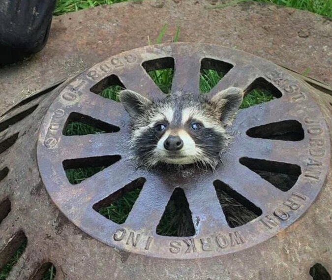 Ekipa pojechała na miejsce i zamarła w osłupieniu. Na chodniku był szop pracz, a na jego szyi, niczym egzotyczna obroża, wisiała żelazna konstrukcja przypominająca pokrywę studzienki kanalizacyjnej. Było to ogrodzenie, w którym miało zostać zasadzone drzewo - takie, jakiego używa się do zabezpieczania zielonych wysepek na środku asfaltu, aby zapobiec uszkodzeniu systemu korzeniowego przez pieszych i rowerzystów.