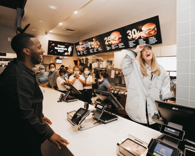 Na poniższym zdjęciu Adele śmieje się przy ladzie restauracji McDonald's, a Paul obserwuje ją z boku kasy. Na jednym z monitorów widnieje napis „Happy Valentine's Day!”, a na pozostałych czterech - tytuły albumów („19”, „21”, „25” i „30”) oraz listy utworów zamiast menu.