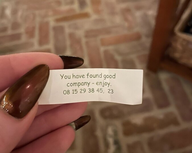 Na innych zdjęciach para, ubrana w takie same koszulki, ogląda grę w softball i całuje się w pokoju hotelowym, najwyraźniej w dniu kręcenia specjalnej edycji programu Adele One Night Only CBS w listopadzie. Najnowsze zdjęcie Adele przedstawia jednak ciasteczko z wróżbą: