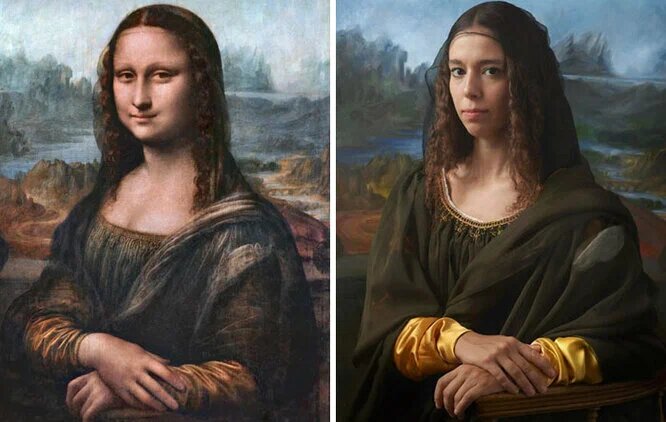 Po lewej: Lisa del Giocondo (Mona Lisa); po prawej: Irina Guicciardini Strozzi, prawnuczka w 15. Pokoleniu