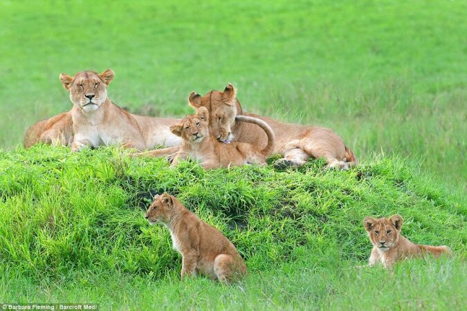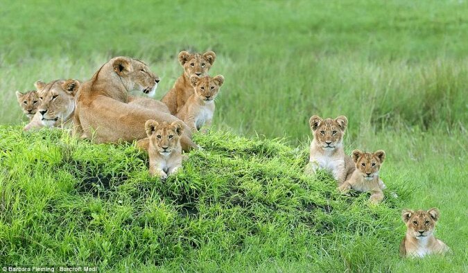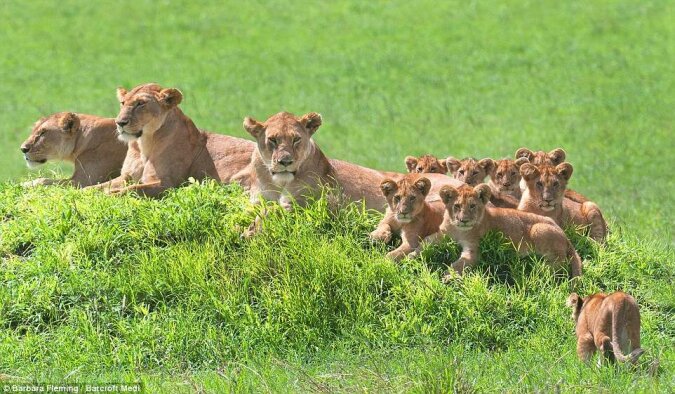 Ale jedno stado lwów ułatwiło sprawę. Cała rodzina w naturalny sposób ustawiła się w rzędzie, tak że wyszło idealne ujęcie.