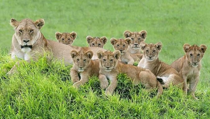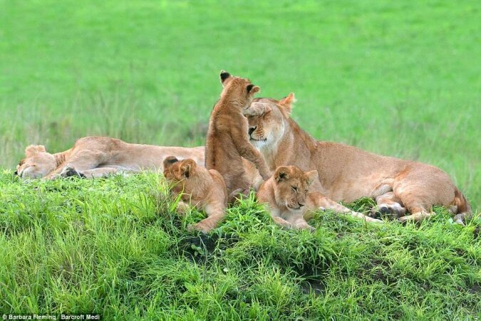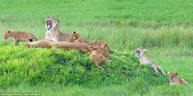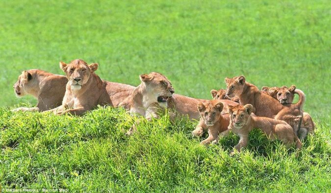 Te wspaniałe zdjęcia pokazują stado trzech lwic wraz z ośmioma młodymi w rezerwacie dzikich zwierząt w Tanzanii.