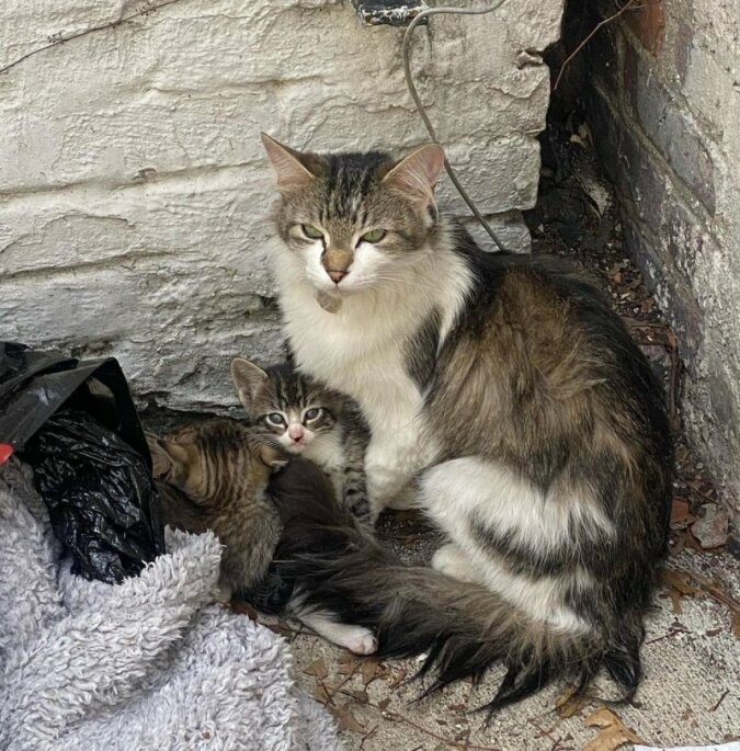 Mieszkańcy Nowego Jorku zauważyli na ulicy tę kotkę z dwoma małymi kociakami. Nie mogli przejść obok tego obojętnie i postanowili choć trochę pomóc kociej rodzinie, która zbierała resztki jedzenia na ulicach. Ludzie zwrócili się o pomoc do pobliskiego centrum ratunkowego.