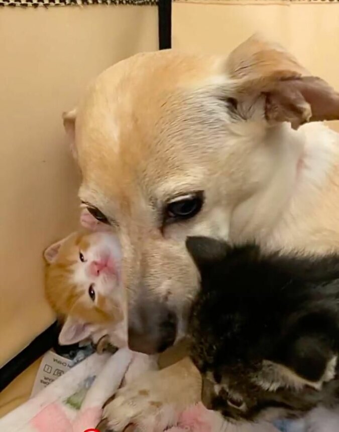 Kobieta przygarnęła kotkę, która kilka dni później urodziła kocięta. Najbardziej ucieszyła się z tego jej sunia, która przyjęła rolę opiekunki i zajmowała się maluchami.