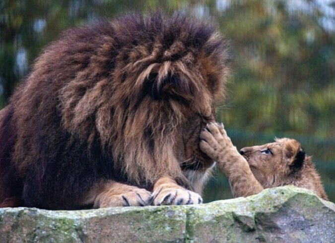 On, podobnie jak lwica, wylizywał swoje dziecko, a lwiątko, wtulone w miękką grzywę lwa, słodko zasypiało. Lew bardzo dobrze wychowywał swojego syna, ale czasami król zwierząt dawał swojemu dziecku porządne lanie.