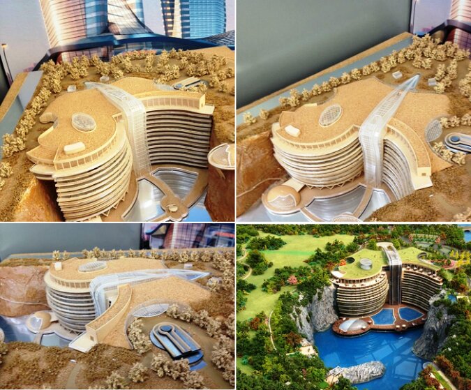 Całkowicie unikalny i zaskakujący projekt brytyjskiej firmy „Atkins” postanowili wcielić w życie Chińczycy. Wysokiej klasy specjaliści z tej firmy przez kilka lat opracowywali koncepcję budowy zupełnie niezwykłego pięciogwiazdkowego hotelu, który nie wznosiłby się w górę, lecz raczej znajdowałby się pod ziemią i pod wodą.
