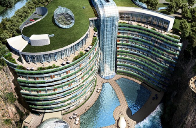 Niebiańskie Imperium po raz kolejny zaskakuje świat swoimi niezwykłymi projektami i wywołuje dyskusje na całym świecie. Niedawno otwarto wspaniały hotel, który znajduje się prawie 90 metrów pod ziemią, w nieczynnym kamieniołomie. Mimo że eksperci twierdzą, że jest to sprzeczne z wszelkimi zasadami i przepisami budowlanymi, hotel zdobył już wiele nagród i został uznany za najbardziej przyjazny środowisku hotel na świecie.