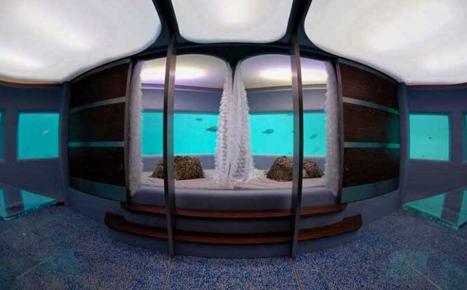 Oznacza to, że dwa piętra znajdują się pod wodą, a na jednym z nich mieści się restauracja rybna z ogromnymi panoramicznymi oknami wychodzącymi na zachwycający podwodny świat. Drugi to specjalny luksusowy apartament z fantastycznym podwodnym krajobrazem za oknem.