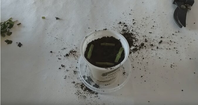 Następnie weź dowolną doniczkę z otworem odpływowym - możesz taką zrobić samodzielnie. Wypełnij doniczkę ziemią, pozostawiając trochę miejsca na zasadzenie rośliny. Następnie należy umieścić sadzonki w glebie pąkami do góry i przykryć ziemią, delikatnie przyciskając, a później podlać.