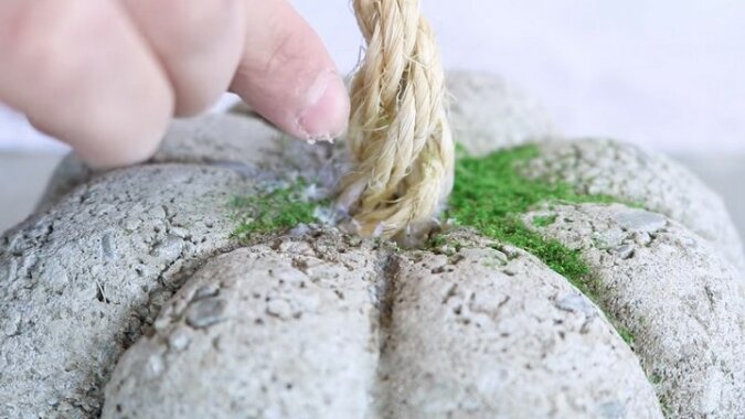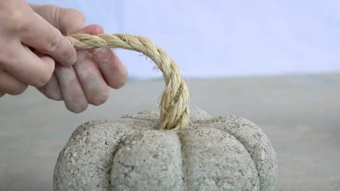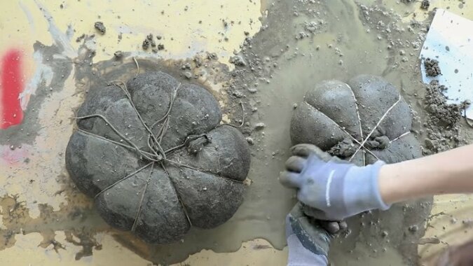 Teraz należy przewiązać przyszłą dynię, tworząc poszczególne segmenty. Jeśli dynia jest duża, użyj sznurka, jeśli mała, wystarczy mocna gumka. Następnie należy poczekać, aż beton dobrze wyschnie.