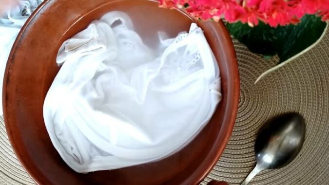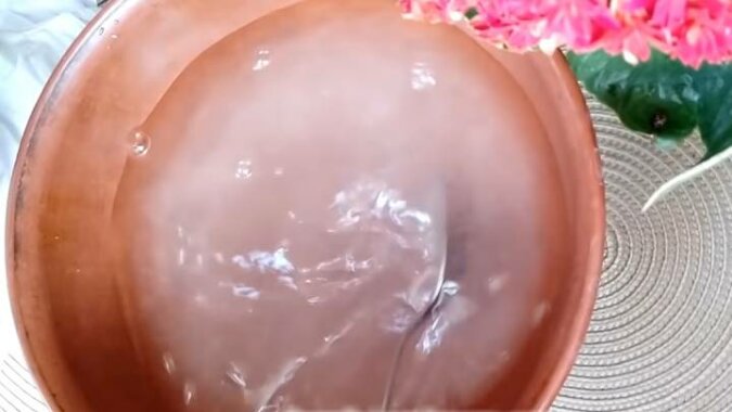 Należy użyć 2 litrów ciepłej wody. Podany sposób działa tylko w ciepłej wodzie, nie w zimnej! Rozpuść w wodzie 2 łyżki sody oczyszczonej i 1 łyżkę 3% nadtlenku wodoru.