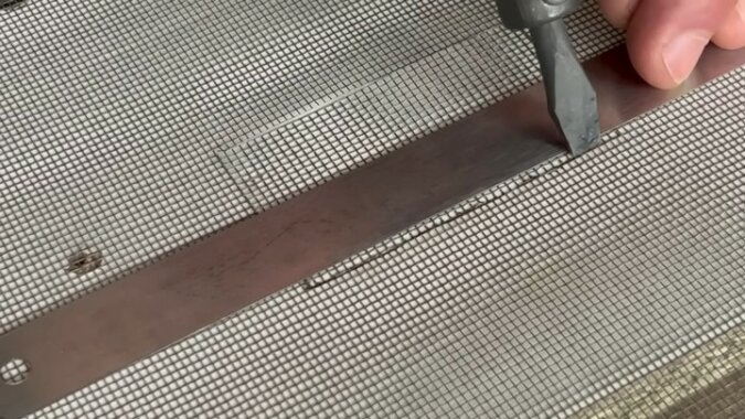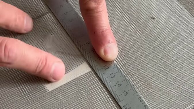 Teraz bierzemy gorącą lutownicę i podkładając metalową linijkę i dotykając ją bardzo delikatnie, idziemy po obwodzie łaty, wyrównując jej krawędź z krawędzią otworu w siatce. Materiał szybko i mocno się skleja.