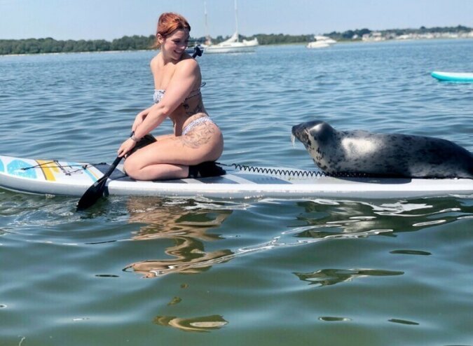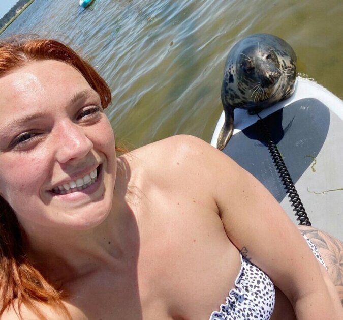 Najpierw popływał około dziewczyny przez około 30 minut, a potem wskoczył na deskę od tyłu. Dziewczyna początkowo bała się nagłego sąsiedztwa, ale foka okazała się młoda i przyjazna.