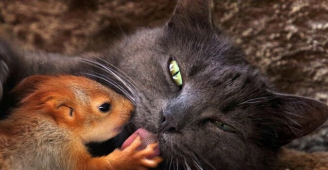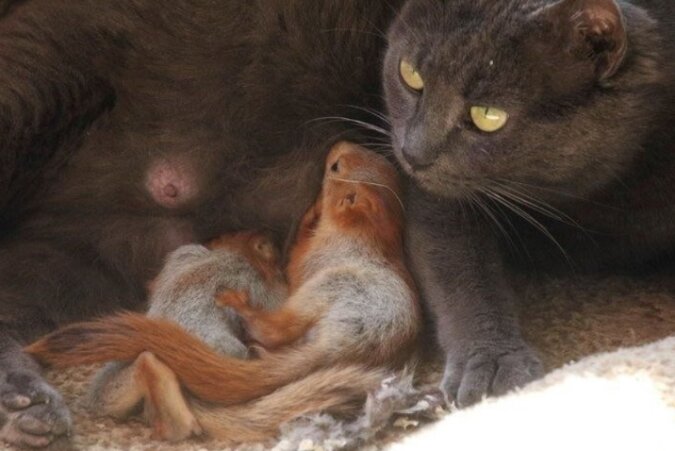 Kotka przyniosła wiewiórki z lasu, gdzie znalazła je tam w samotności. Pojawił się instynkt macierzyński. Kotka zaniosła młode do stodoły, gdzie zadomowiła się z nimi. Teraz Luna ma sporo pracy - musi wychować swoje „adoptowane” dzieci.