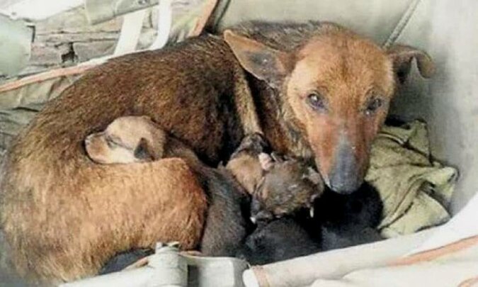 Bezdomna sunia przyjęła niemowlaka jak prawdziwa mama i grzała go ciepłem własnego ciała, chroniąc przed zimową pogodą.