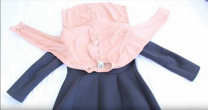 Kolejną warstwą są koszule i bluzki. Ułóż je na wierzchu płaszcza lub kurtki w odbiciu lustrzanym (jak na zdjęciu), guzikami do góry.