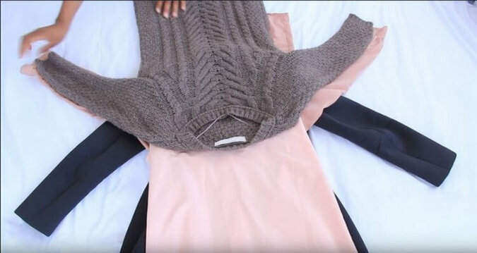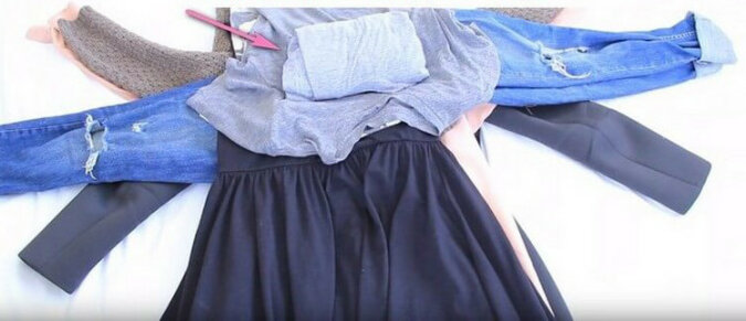 Dodaj jeansy lub spodnie: poziomo, symetrycznie do pierwszej pary. Można je ułożyć w stosie wszystkie naraz. Ale rozdzielenie ich i włożenie między nie T-shirtów i lekkich sukienek znacznie lepiej uchroni te ostatnie przed zagnieceniami.