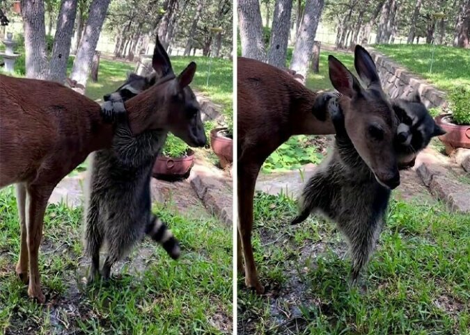W przyrodzie jest wiele przykładów niespodziewanych przyjaźni zwierząt - i zawsze miło się na to patrzy! Ten uratowany szop i sarenka zostały najlepszymi przyjaciółmi. Poznały się w schronisku dla zwierząt i cudem odnalazły wspólny język.