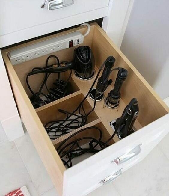 Wysuwane szuflady nie tylko ukrywają drobne urządzenia, ale w razie potrzeby można do nich doprowadzić zasilanie.