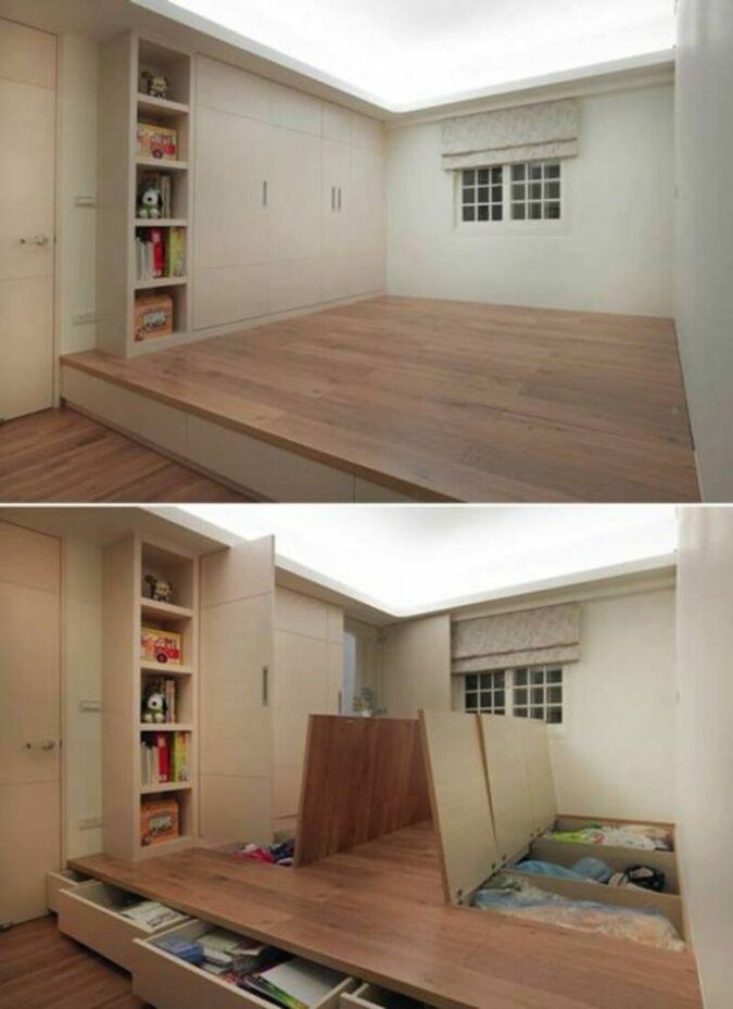 Takie sprytne wykorzystanie wolnego miejsca jest wspaniałym pomysłem, oszczędzając miejsce i zapewniając jednocześnie dodatkowe przechowywanie.