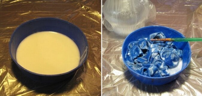 Rozcieńcz klej PVA w odrobinie wody. Dzięki temu klej lepiej wchłonie się w tkaninę. Unikaj zbyt płynnej konsystencji, bo inaczej doniczka nie będzie trzymała kształtu. Zanurz tkaninę całkowicie w kleju, a następnie wyciśnij ją. Powtórz ten etap kilka razy..