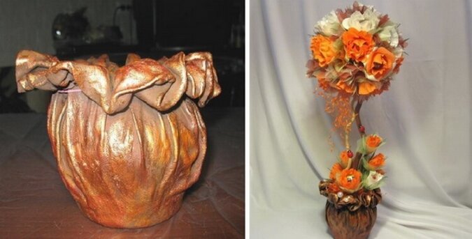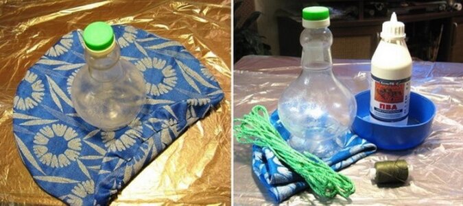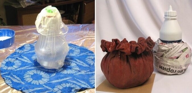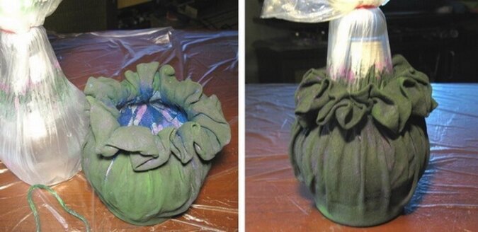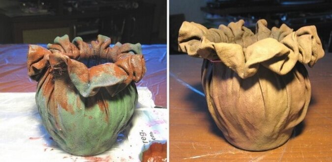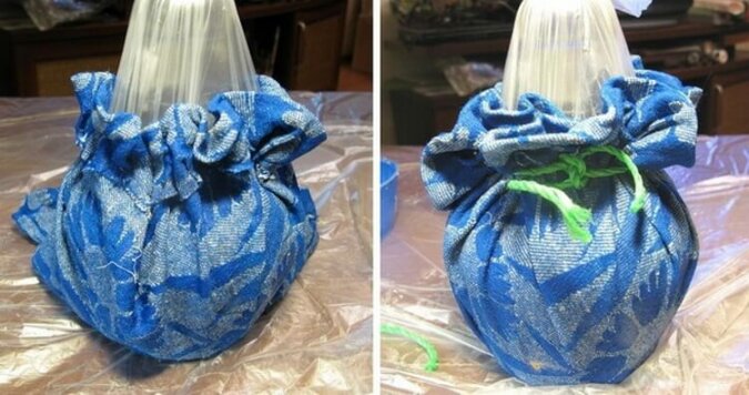 Umieść tkaninę na formę. Przymocuj szyjkę doniczki za pomocą sznurka. Na tym etapie można uformować zagniecenia. Pozostaw doniczkę do całkowitego wyschnięcia. Możesz umieścić ją pod kaloryferem lub wysuszyć suszarką do włosów, jeśli nie chcesz długo czekać.