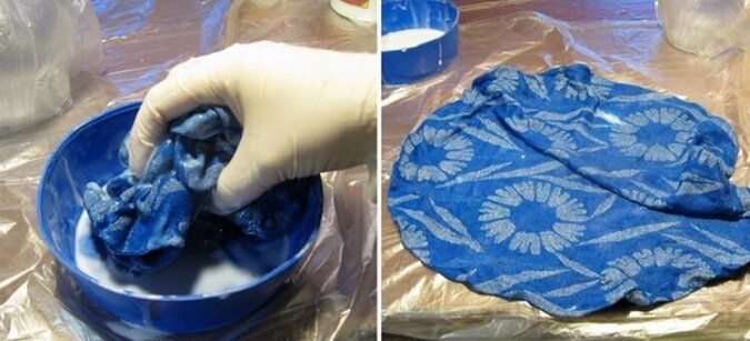 Zanurz tkaninę po raz ostatni i umieść ją na powierzchni roboczej. Wewnętrzna część powinna znaleźć się na dole.