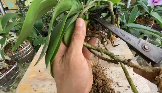 Przed przesadzeniem storczyka należy przyciąć uszkodzone lub uschnięte korzenie.