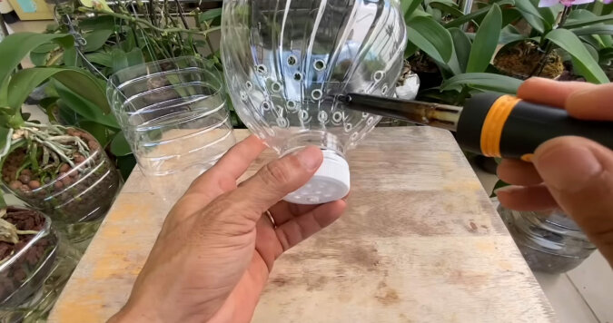 Odetnij górną część 5-litrowej plastikowej butelki i zrób w niej liczne otwory.