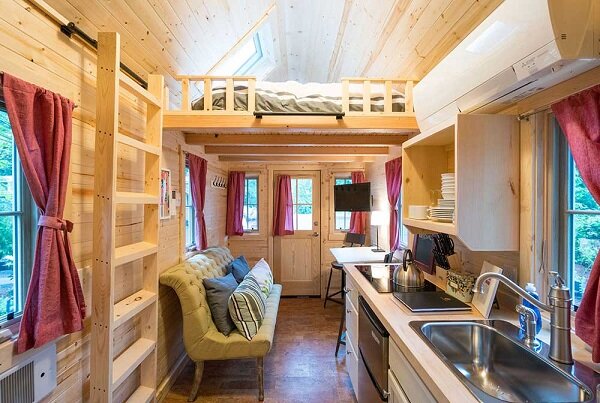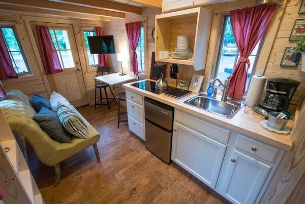 Jest niewielki, przytulny, ale wygodny i wielofunkcyjny. W domku znajduje się kuchnia z płytą kuchenną i zlewem, pokój dzienny z kanapą, łazienka z prysznicem, umywalką i toaletą oraz przytulna sypialnia.