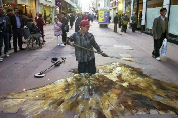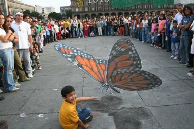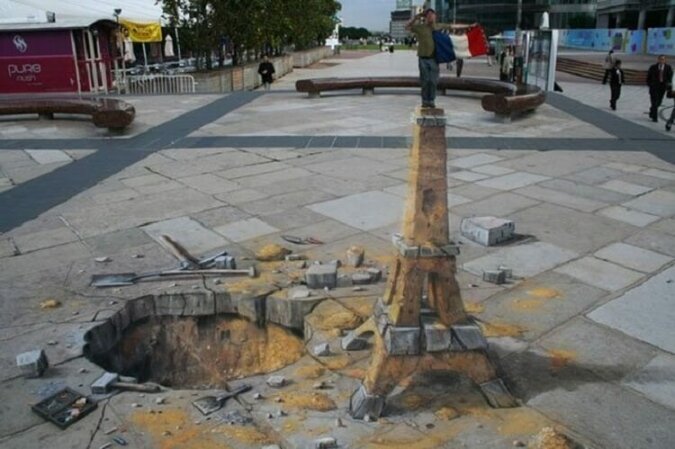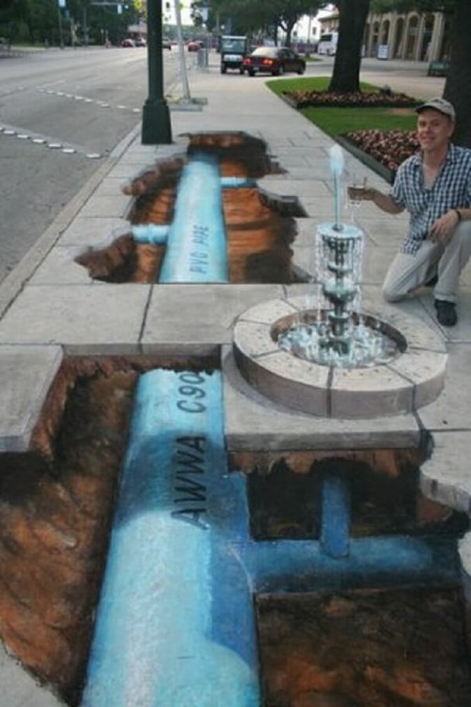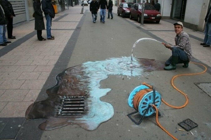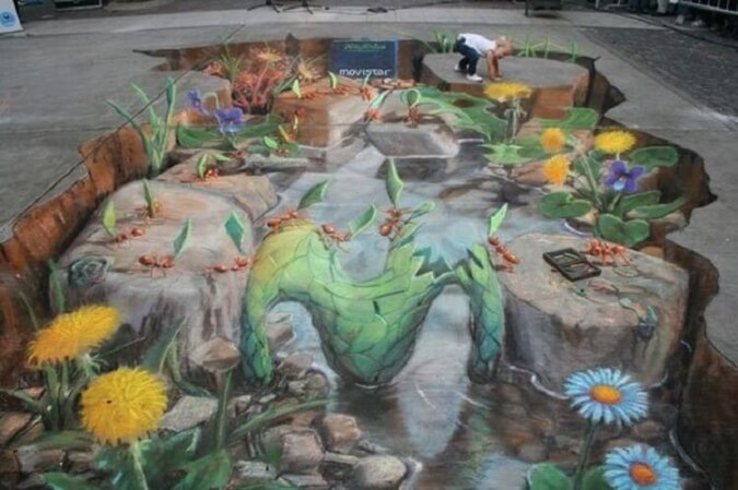 Obrazy są narysowane w taki sposób, że można je zobaczyć tylko pod pewnym kątem. Są tak realistyczne, że trudno uwierzyć, że zostały narysowane zwykłą kredą na chodniku.
