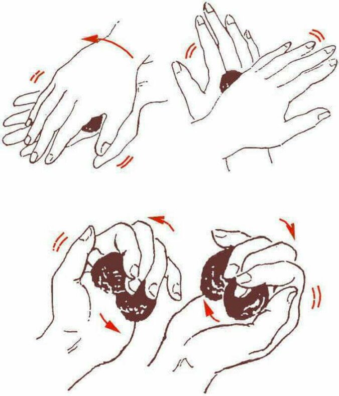 3. Trzymając jednocześnie po dwa orzechy w każdej dłoni, wykonuj koliste ruchy (w prawej dłoni zgodnie z ruchem wskazówek zegara, w lewej - przeciwnie do ruchu wskazówek zegara).