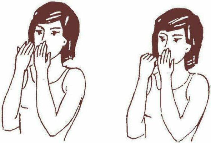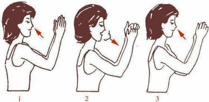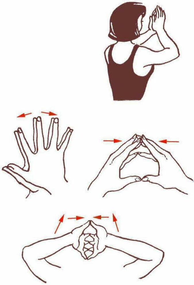 2. Wydychając przez usta, lekko opuść prawą rękę w dół, jednocześnie zginając palce lewej ręki i chwytając opuszki palców prawej ręki.