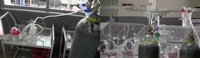 Więc Dr. Gessesse stworzyła własną maszynę do wspomagania oddychania. Wykonała te prowizoryczne maszyny CPAP dla swoich małych pacjentów, używając zbiorników tlenu, rurek i wody.