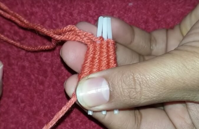 Zacznij przekładać włóczkę między patyczkami, stopniowo przyciągając je do siebie.