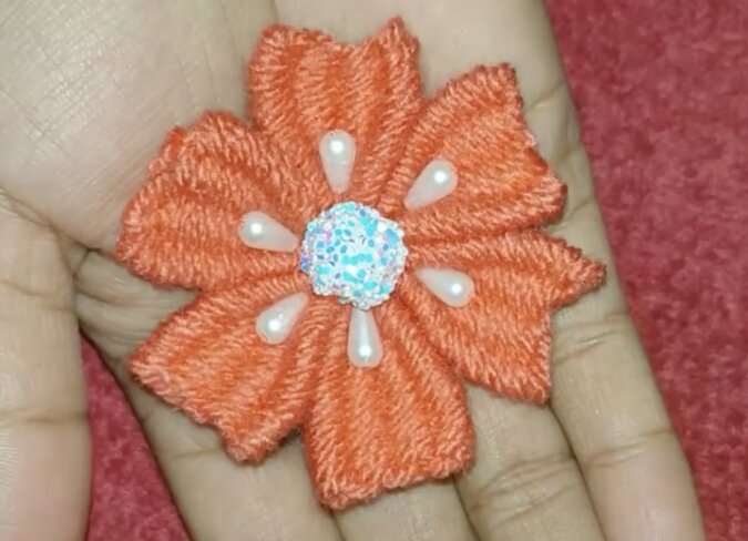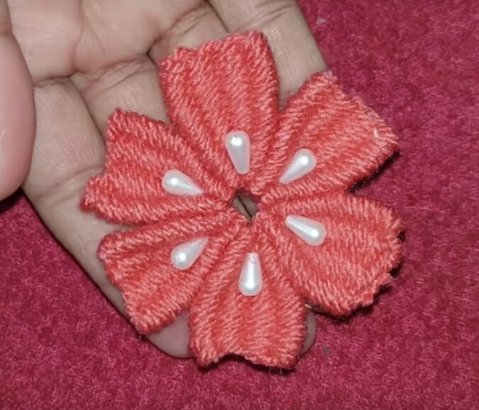 Zawiąż supełek. Umieść koraliki na środku płatków.