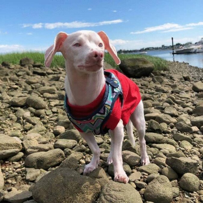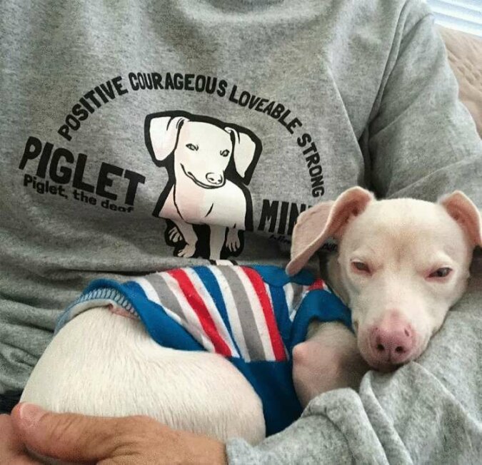 Poznajcie szczeniaka o imieniu Prosiaczek, który urodził się z nietypowym różowym umaszczeniem. Jest to mieszaniec jamnika i chihuahua, ale niestety jego rodzice mieli gen, który spowodował, że maleństwo urodziło się głuche i ślepe.