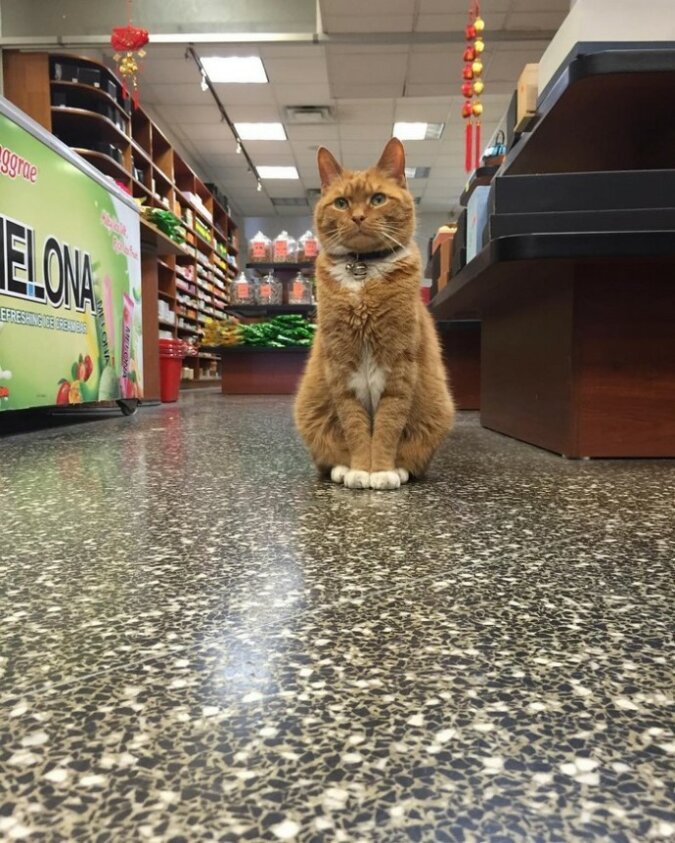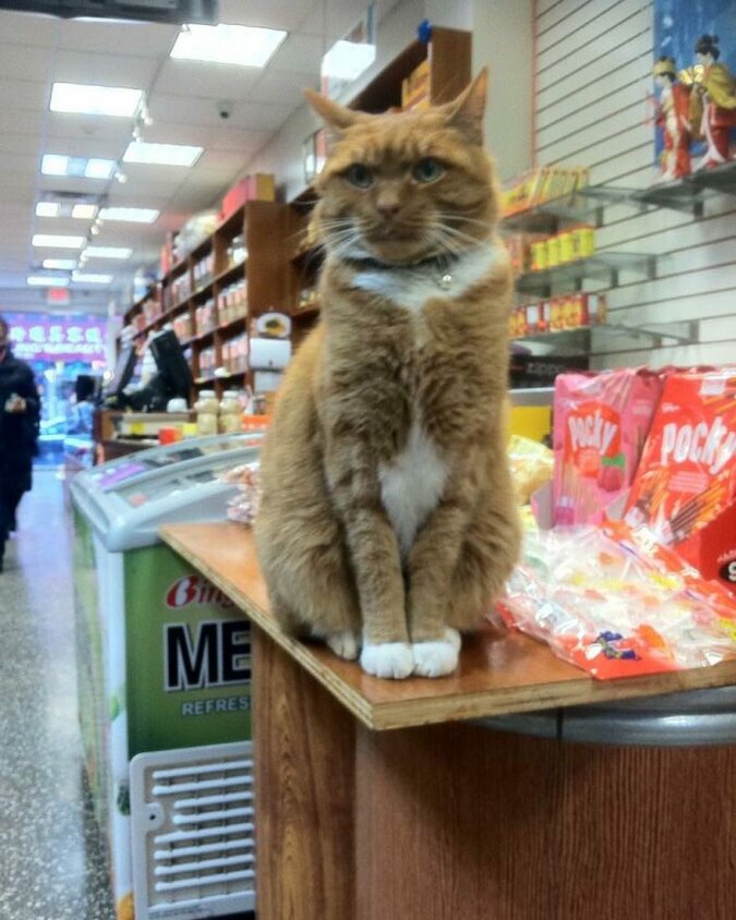Bobo wykonywał wszystkie podstawowe zadania niezbędne w sklepie, takie jak siedzenie na każdym przypadkowym kawałku tektury, patrzenie przez okno i miauczenie na klientów.