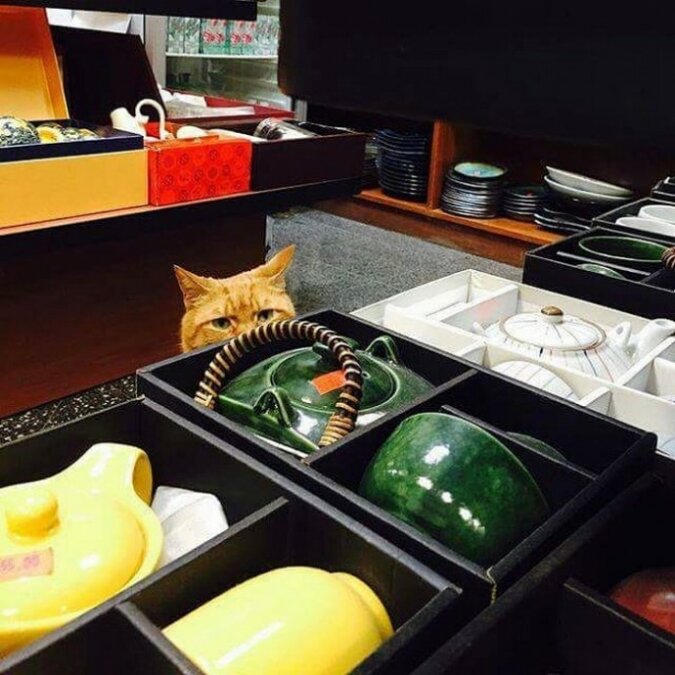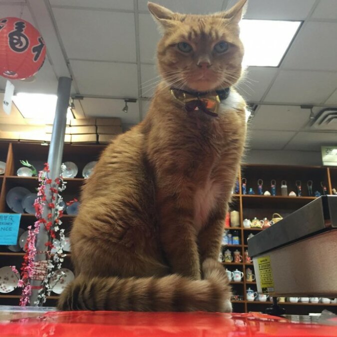 Czasami jego koci przyjaciel, o imieniu Sushi, odwiedzał go w sklepie.