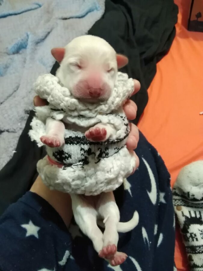 Nie wiadomo, jak ten dopiero co urodzony szczeniak znalazł się na dworze w mroźny dzień, ale miał dużo szczęścia. Obok niego, piszczącego maleństwa, z którego wciąż sterczała pępowina, przechodziła para. Mąż i żona usłyszeli słabe pisknięcie dochodzące z zaspy śniegu. Gdy podeszli bliżej, zobaczyli drżące biedne maleństwo i nie mogli zostawić go na pastwę losu.