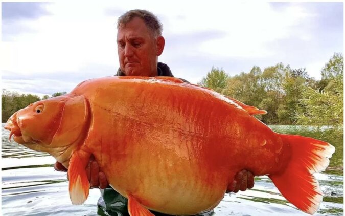 Ryba ta, ważąca 30 kilogramów, była uważana za bardzo nieuchwytną, ale brytyjskiemu rybakowi udało się ją w końcu złapać. Jest to hybrydowy gatunek karpia i karpia koi. Złapanie tej ryby zajęło Brytyjczykowi 25 minut. Rybacy nazywają tę rybę „Marchewką” ze względu na jej jaskrawy pomarańczowy kolor.