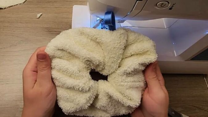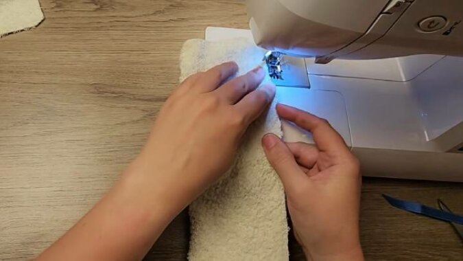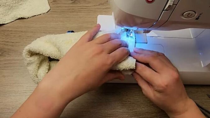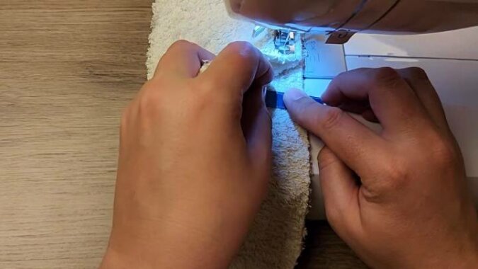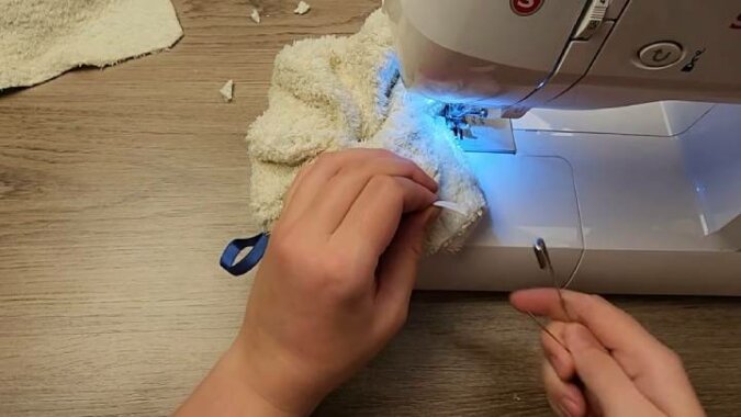 Pozostaje niezaszyta dziura. Włóż przez nią gumkę i ręcznie zszyj brzegi.