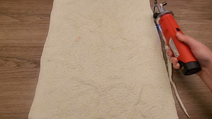 Przetnij na pół na dwa równe długie prostokąty. Każdy prostokąt złóż na pół, zostawiając 3 cm od góry i zszyj, tak samo zostawiając 3 cm na dole.